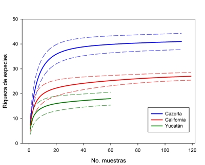 Siguiendo protocolos de muestreo similares, nuestro estudio permitió comparar la riqueza de plantas polinizadas por animales de las tres comunidades vegetales mediante la identificación y cuantificación de las especies que florecen en la época de máxima floración: Mayo-Junio en Cazorla, Junio-Julio en California y Agosto-Septiembre en Yucatán. Para ello se establecieron 20-30 cuadros permanentes de muestreo por localidad y 3-5 localidades de estudio en cada región, que se visitaron periódicamente durante el periodo de estudio, anotando la identidad de las especies en flor. Por lo tanto, se ignoraron las especies no polinizadas por animales, las que no florecieron dentro del periodo de estudio y aquellas de identidad taxonómica confusa que ocurrieron en menos del 10 % de las muestras de cada región. Además, en las comunidades dolomíticas y serpentinas la lista total de especies se filtró eliminando las especies no asociadas al tipo de suelo correspondiente pero que aparecen dentro de los cuadros de muestreo por la heterogeneidad de éstos dentro de los mismos y siempre que su presencia no superara el 20 % de las muestras.